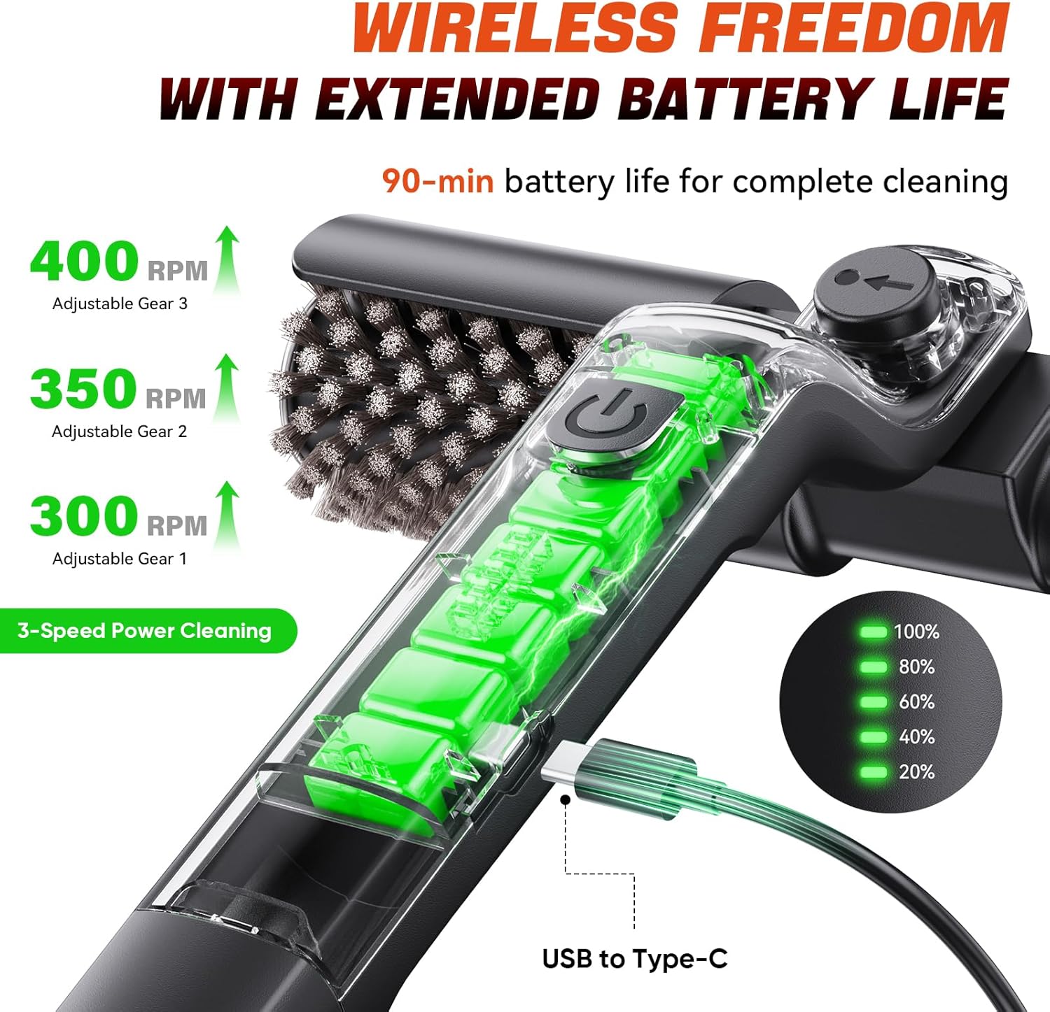 ✅ Powerful 300-450 RPM Spin – Robust motor maintains high-speed rotation even under pressure, dissolving stubborn grime effortlessly.