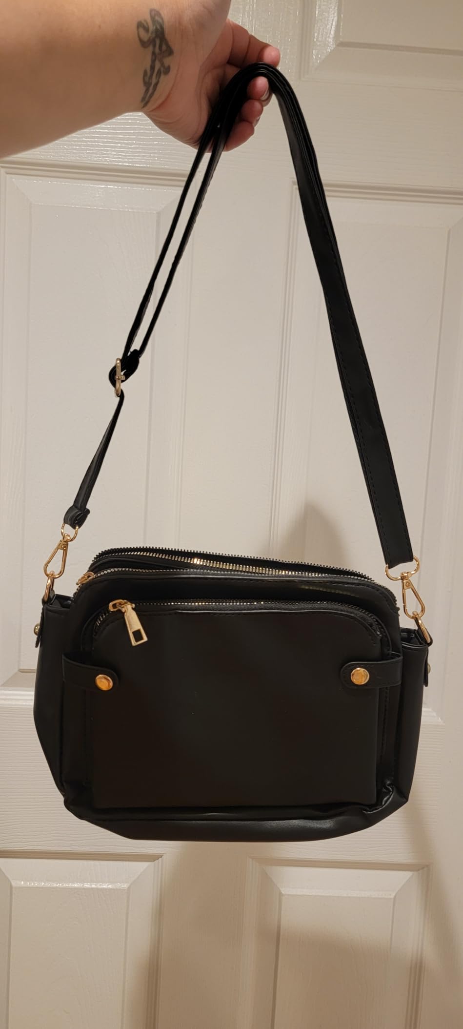 I was looking for a smaller size bag to carry just essential items while running errands so I ordered this one. I am surprised it has a lot of pockets and space to keep items. There are 3 zipper pockets and 1 button pocket. Additionally it also expands from the middle when the front 2 buttons are open and it has the card slots in there. The strap is adjustable and can be easily used as crossbody. I really love this bag—it’s not only practical and spacious but also stylish, and it has quickly become my go-to for daily errands.
