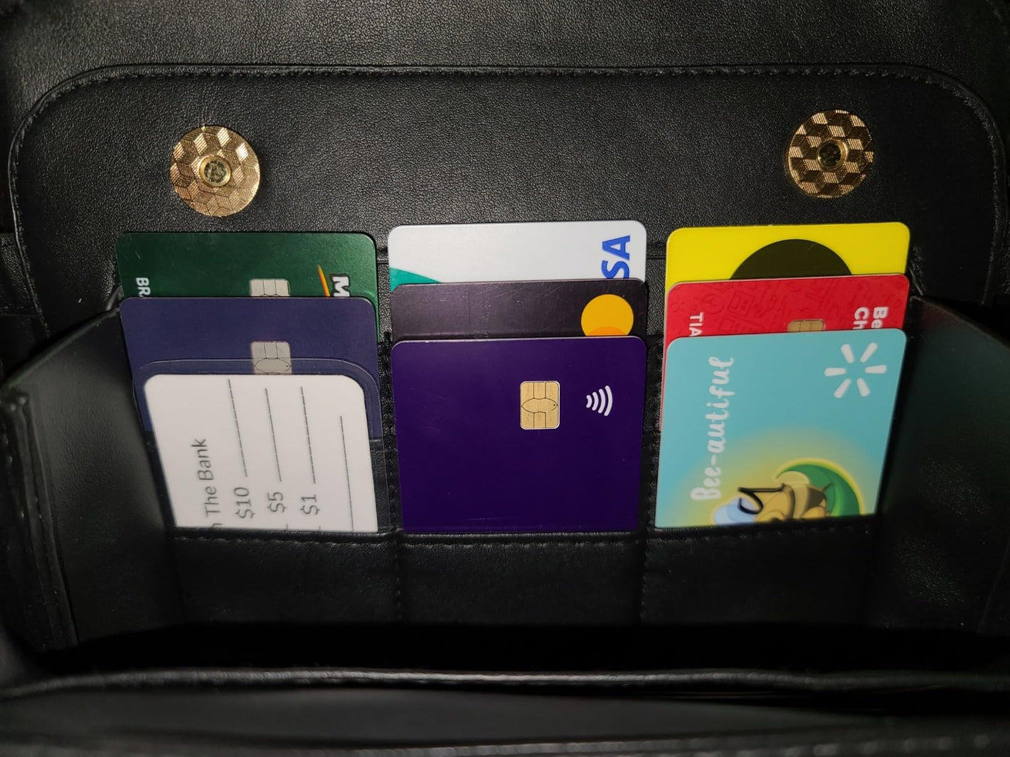 Update...now that I've used it a few times, the snaps on the wallet area aren't a problem. Especially if I have it on like a cross body purse. Snaps easily now. Love it and definitely would recommend buying. Just got mine and I really like it. It's very soft and holds quiet of bit. Mine has 8 card slots instead of 6 and no trouble getting them in or out.